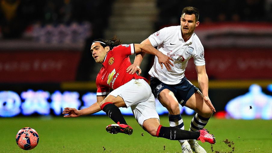 Marouane Fellaini akichuana na mchezaji wa Preston North End difenda Bailey Wright na kuumia pua baada ya kupigwa na kiwiko.