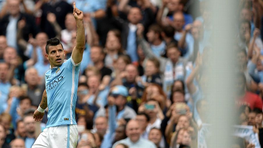 Sergio Aguero akishangilia bao lake la kwanza dhidi ya Chelsea.Mbele ya Mashabiki 54,331 Uwanjani kwao Etihad, Manchester City Leo wamewabonda Mabingwa wa England Chelsea Bao 3-0 katika Mechi ya Ligi Kuu England.