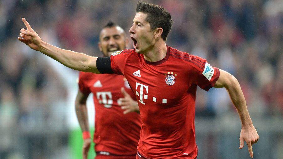 Robert Lewandowski akishangilia baada ya kuipiga vilivyo Wolfsburg