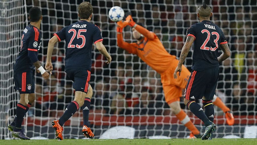 Kipa wa Bayern Munich Neuer akiokoa shuti langoni mwake katika kipindi cha kwanza kilichomalizika 0-0 dhidi ya Arsenal. Kipindi cha pili dakika ya 55 Ramsey aliumia na nafasi yake imechukuliwa na Alex Oxlade-Chamberlain